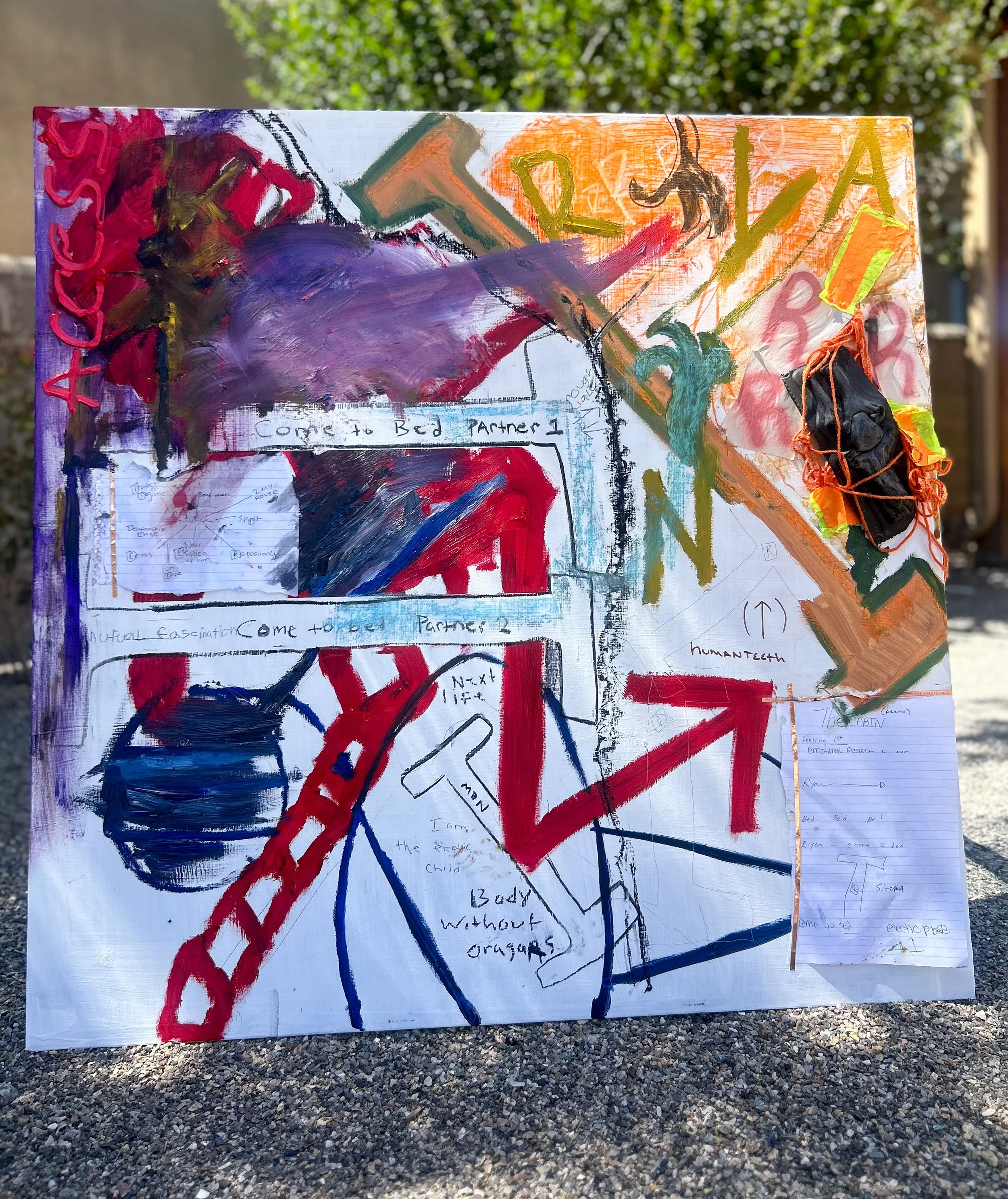 2nd part DNA shadow 2024 Oil on canvas, joint compound, graphite, tissue paper, legos, string, lace, plastic sheet, copper wire 30x30 inch